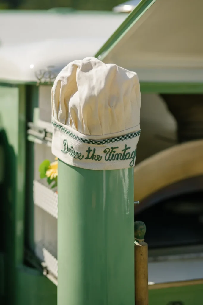 Our Ape-Pizza is a beautifully restored 1970s Piaggio Ape, painted in sage green and equipped with a professional gas-powered oven.